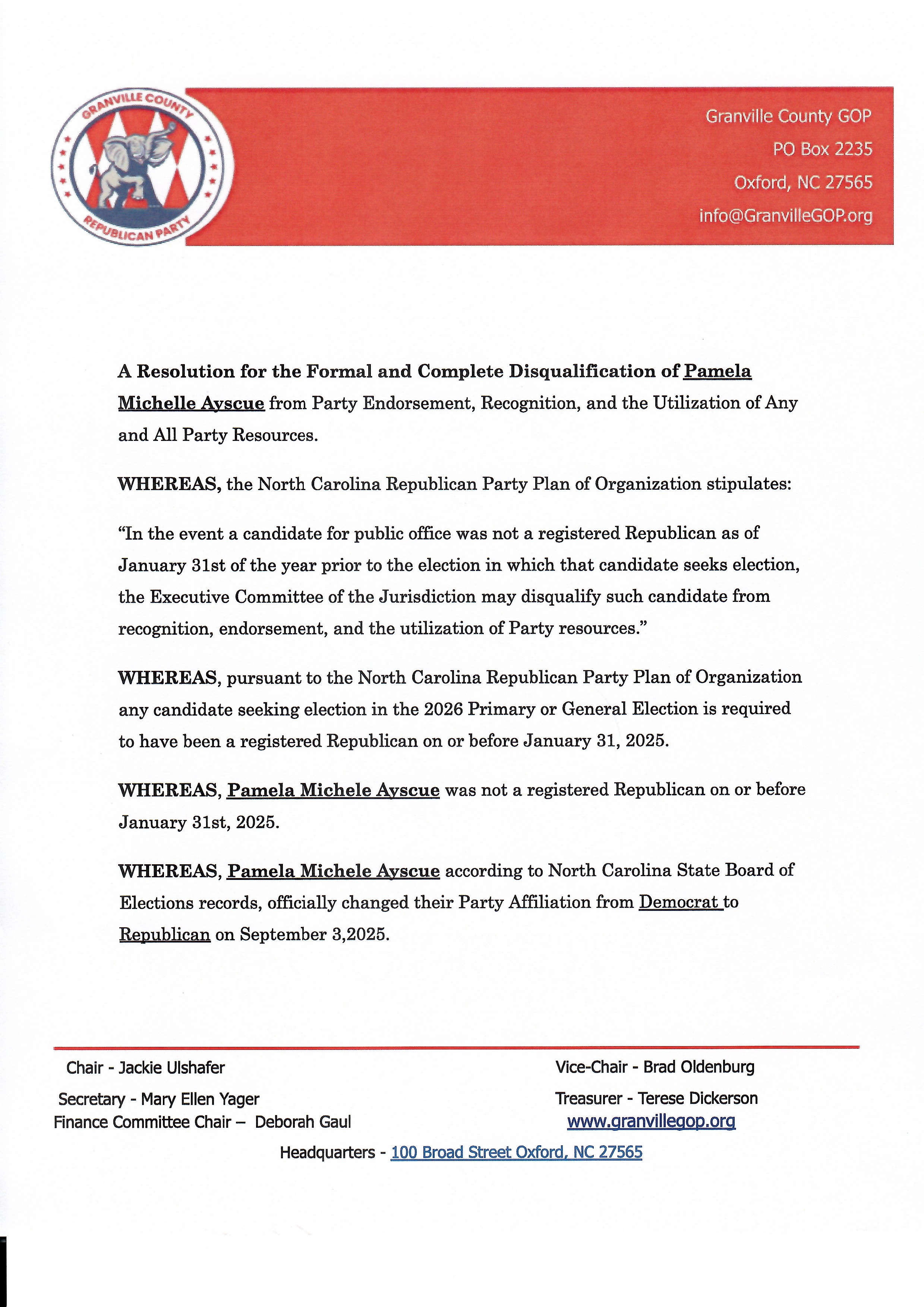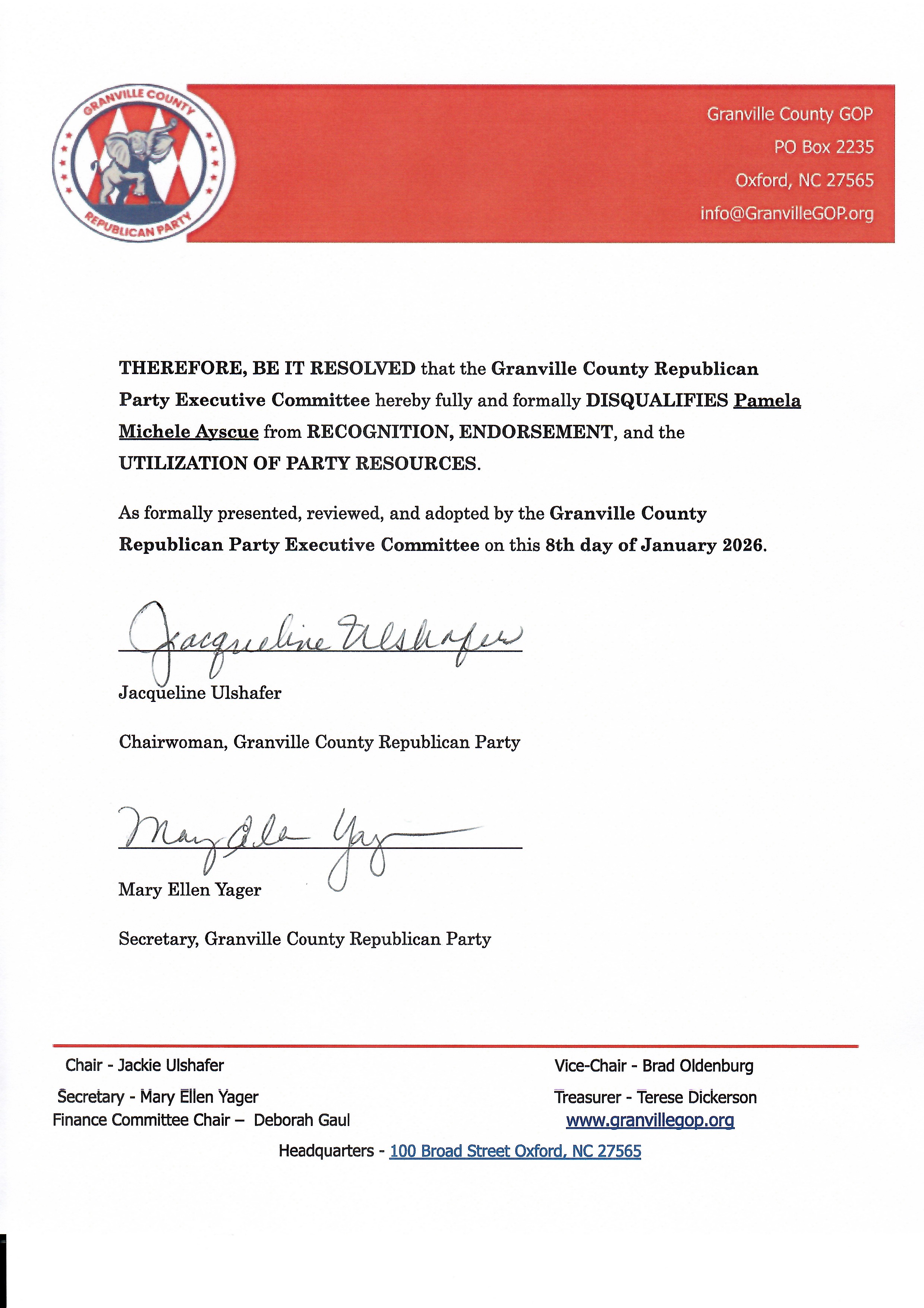 Disqualifying Resolution - Pamela Ayscue